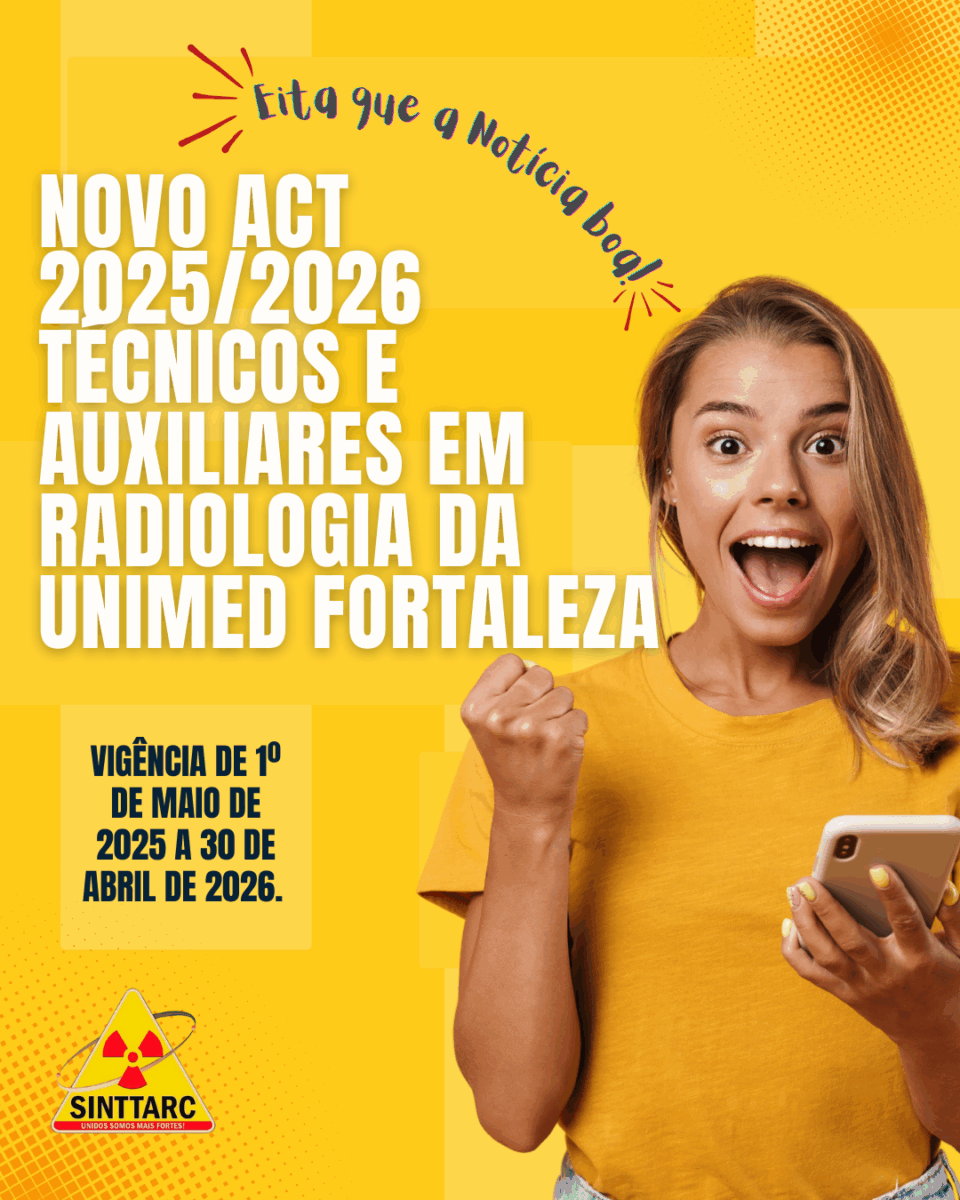 Setembro 9, 2025O Sindicato dos Técnicos, Tecnólogos e Auxiliares em Radiologia do Estado do Ceará (SINTTARC) firmou com a UNIMED Fortaleza o Acordo Coletivo de Trabalho 2025/2026, registrado no Ministério do Trabalho e Emprego sob o número CE001259/2025, com vigência de 1º de maio de 2025 a 30 de abril de 2026.