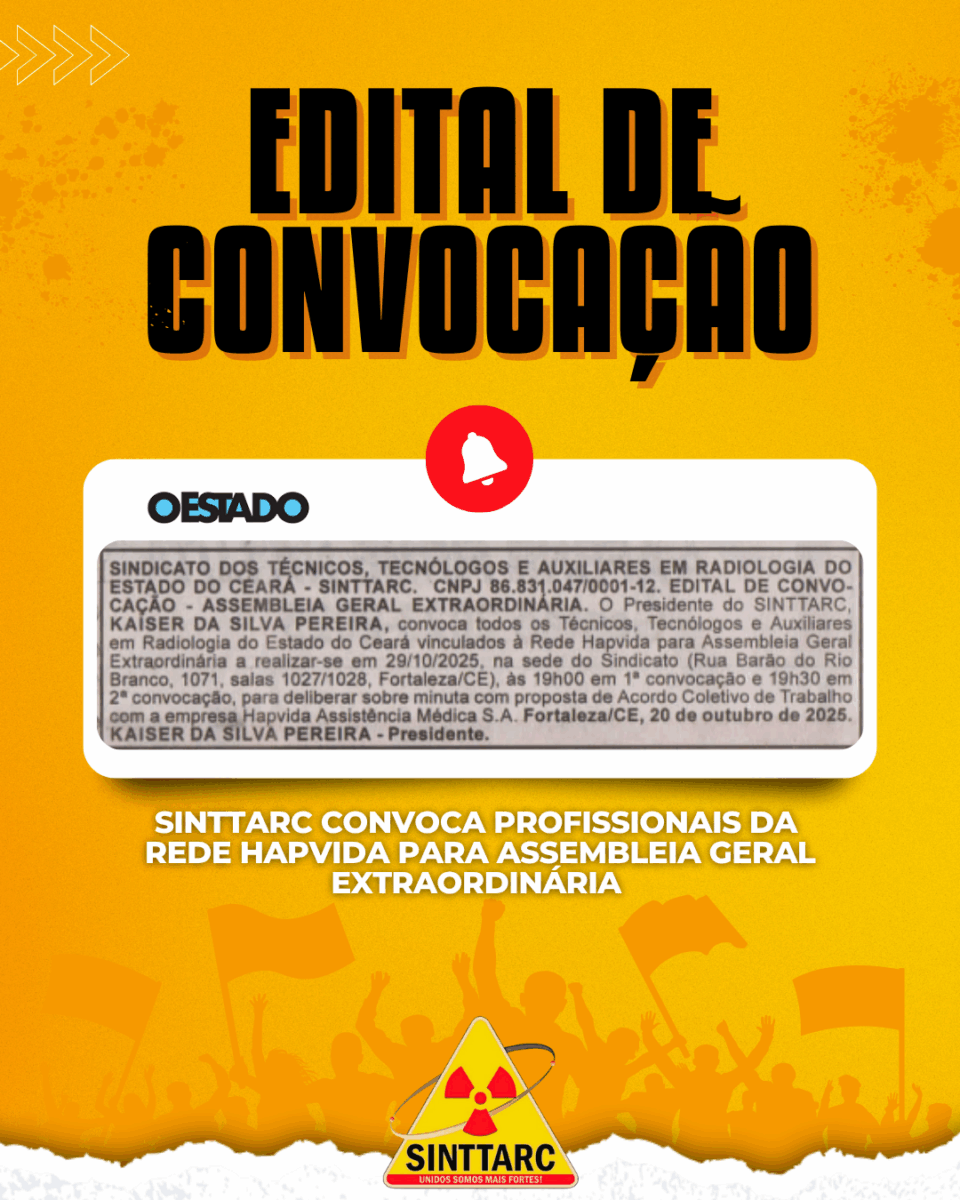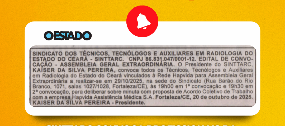 Novembro 13, 2025O Sindicato dos Técnicos, Tecnólogos e Auxiliares em Radiologia do Estado do Ceará (SINTTARC), por meio de seu presidente Kaiser da Silva Pereira, no uso de suas atribuições estatutárias, convoca todos os profissionais da categoria vinculados à Rede Hapvida para participarem de uma Assembleia Geral Extraordinária. A assembleia será realizada no dia 29 de outubro de 2025, na sede do sindicato, localizada na Rua Barão do Rio Branco, nº 1071, Edifício Lobrás, salas 1027 e 1028 – Centro, Fortaleza/CE.