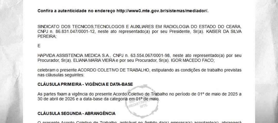 Março 16, 2026O SINTTARC tem a satisfação de informar que foi homologado e registrado no Ministério do Trabalho o Acordo Coletivo de Trabalho (ACT) 2025/2026 firmado com a empresa Hapvida Assistência Médica, garantindo direitos e avanços importantes para os técnicos e auxiliares em radiologia que atuam na empresa no estado do Ceará.